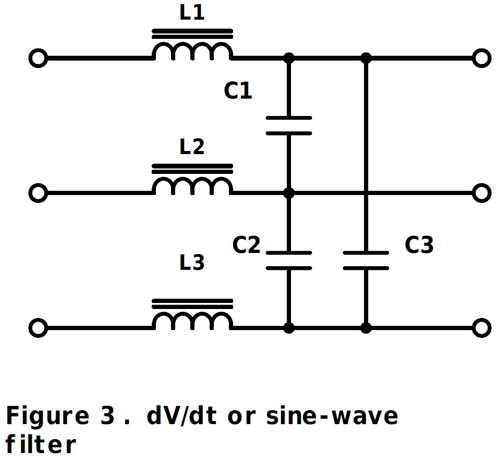 A solution for longer cable lengths up to about 100 m is a ‘dV/dt filter’ shown in Figure 3. This is effectively a low-pass filter on each phase with a cut-off frequency greater than the inverter switching frequency. It operates to limit motor insulation stress and noise even further but again does not reduce bearing wear and common-mode EMI, so a screened motor cable is still required.