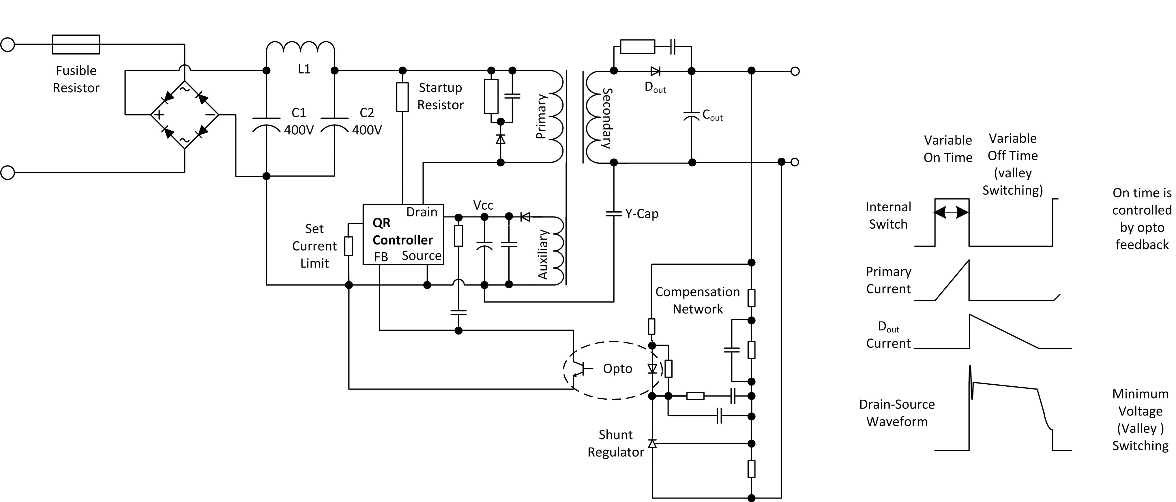 Figure 2: Quasi-resonant AC/DC converter schematic with optocoupler feedback