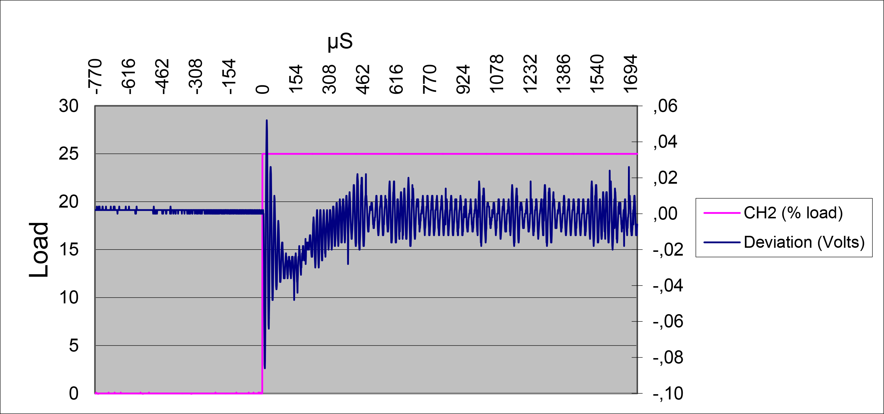 Figure 4: Example of a 0 to 25% load transient response. The voltage deviation is less than 90mV with a recovery time of around 300µs. The 25 to 0% load transient response is similar