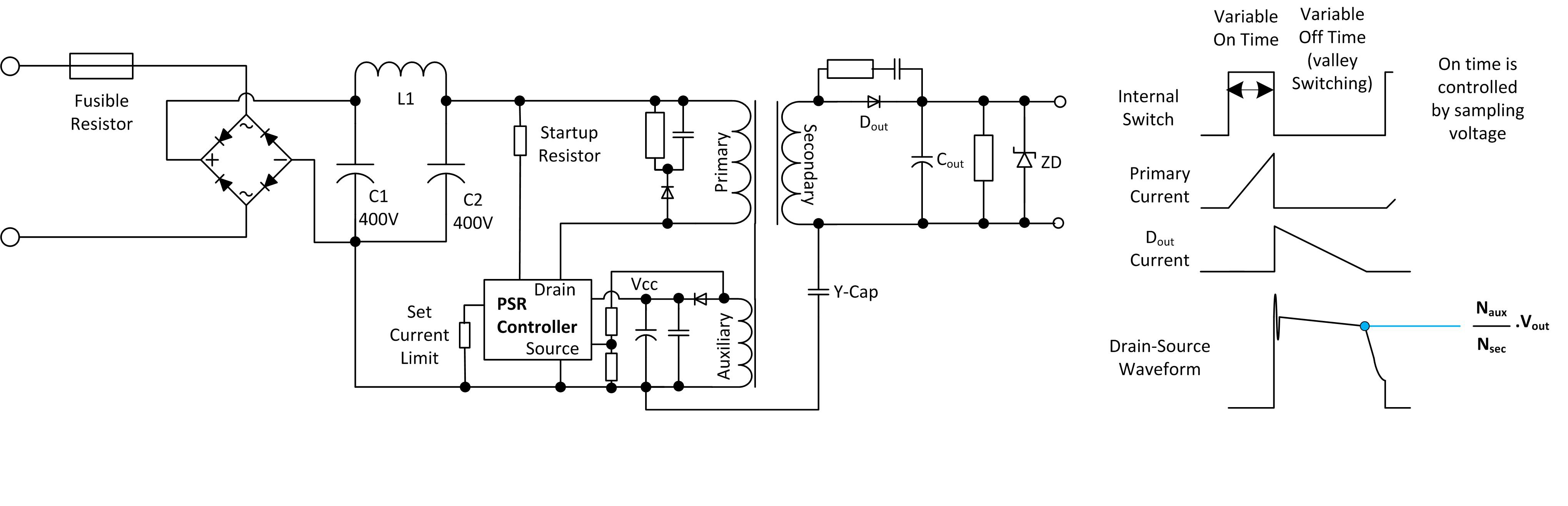 Primary sided regulation relies on sampling the reflected output voltage at a certain point on the primary side waveform (Figure 3), so it can monitor and regulate the output voltage without the need for a shunt regulator or an optocoupler. Although the waveforms are very similar to the optocoupled design, the PSR circuit achieves a similar performance with fewer components, so the power supply can be made much smaller. The output voltage is calculated by sampling the knee-point on the primary side waveform.