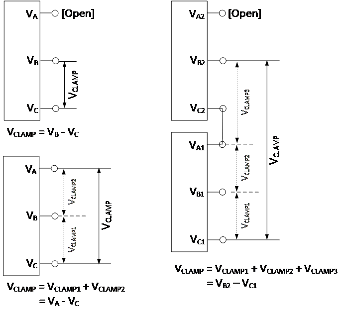 Figure 3 show a single clamp (top left) and a stacked clamp (right). The single clamp must be between VB and VC with VA left open. For the circuit below (bottom left), the basic clamp level is doubled by stacking VCLAMP1 and VCLAMP2.