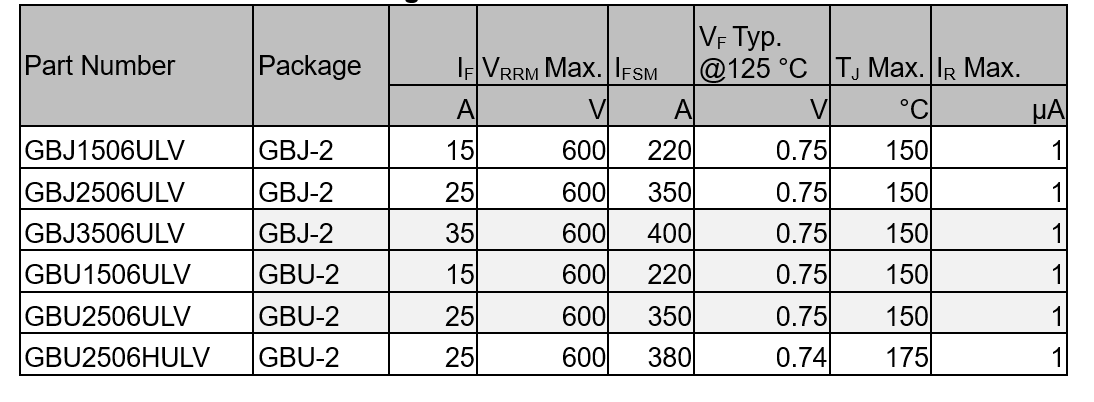 Overview of ultra-low LVF bridge rectifiers of the GBJ- and GBU-series: