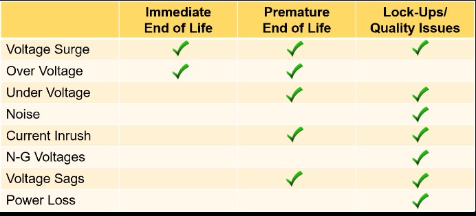 Depending on the magnitude and duration, these power anomalies cause electrical equipment malfunction that can be categorised as immediate equipment failure, premature end of life, or lockups (see Table 1).
