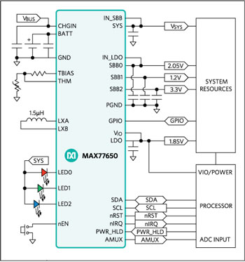 The MAX77650 and MAX77651 feature single inductor multiple output (SIMO) buck-boost regulators that provide three independently programmable power rails from a single inductor, 150mA LDO, and three current sink drivers to reduce overall component count and maximize available board space.