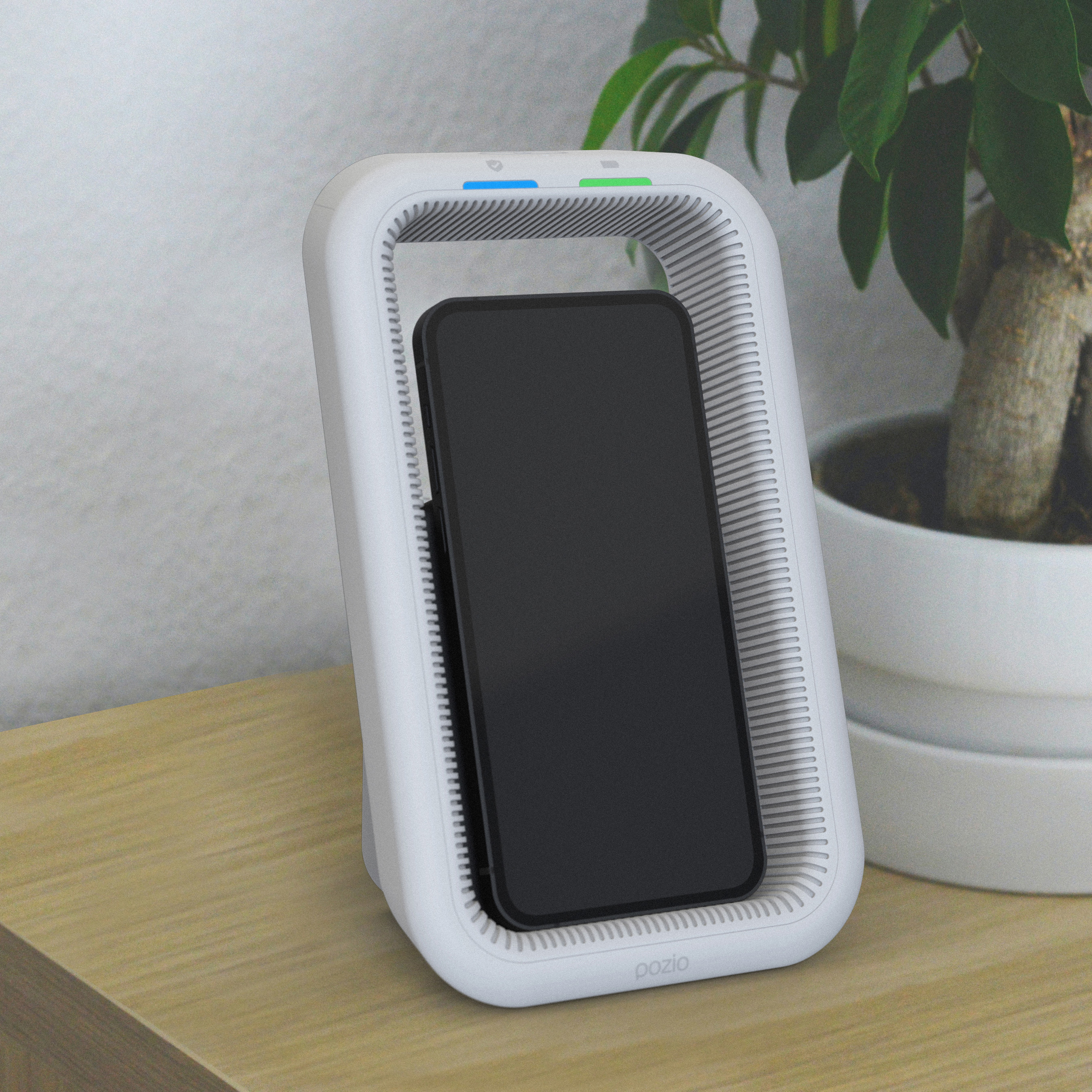 Patented technology works in the background to prevent the always-listening microphones in smart devices from hearing private conversations when the phone is in the Cradle. An embedded speech trigger recognition systems can only hear one command. When the command “Pozio Stop” is given, this turns off the sound blocking technology for 30 seconds, for the user to access, summon and issue commands, like “turn on the downstairs lights” to the phone’s smart assistants. The Cradle does not record a person’s voice, nor does it have a hard drive and it is not connected to the internet so cannot store or share any personal information.