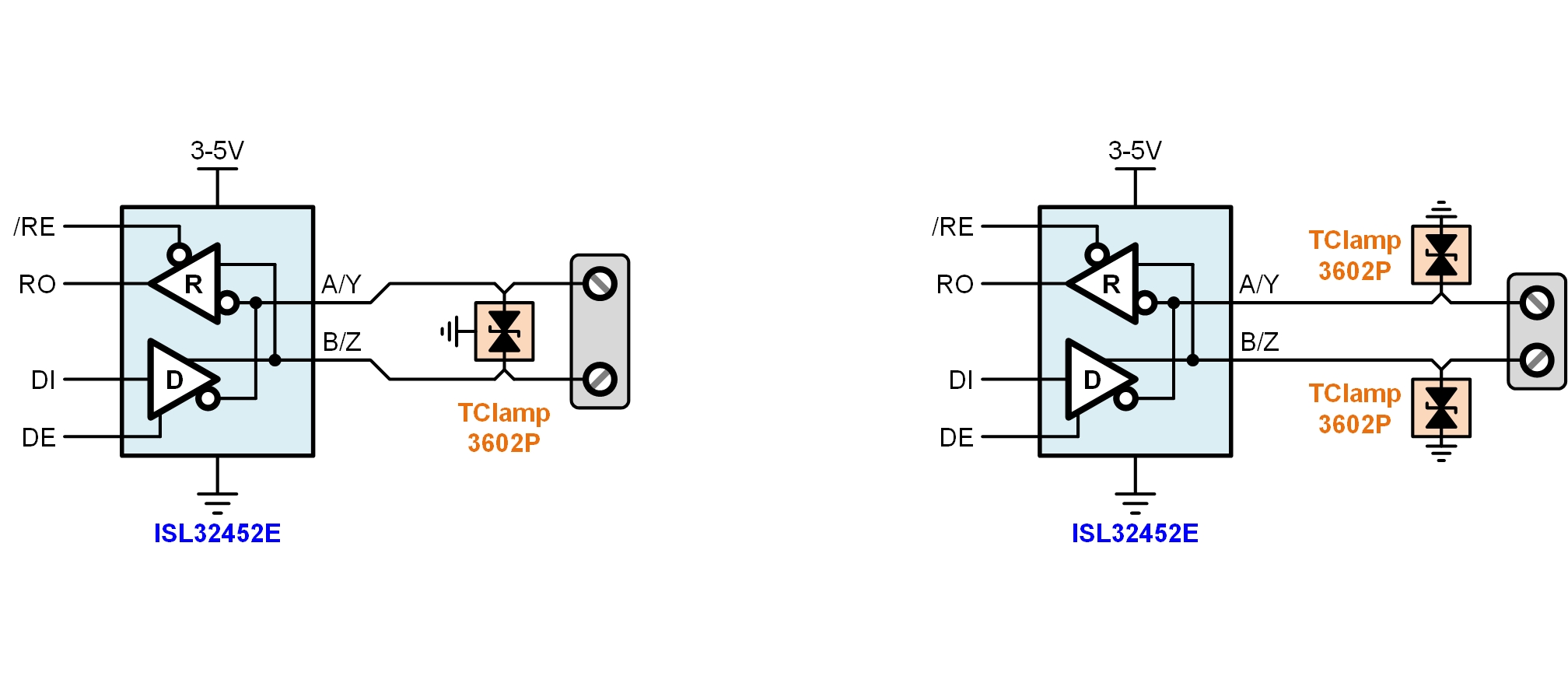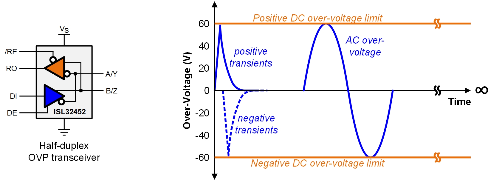 Figure 1: Over-voltage protected RS-485 transceiver Symbol and voltage range.