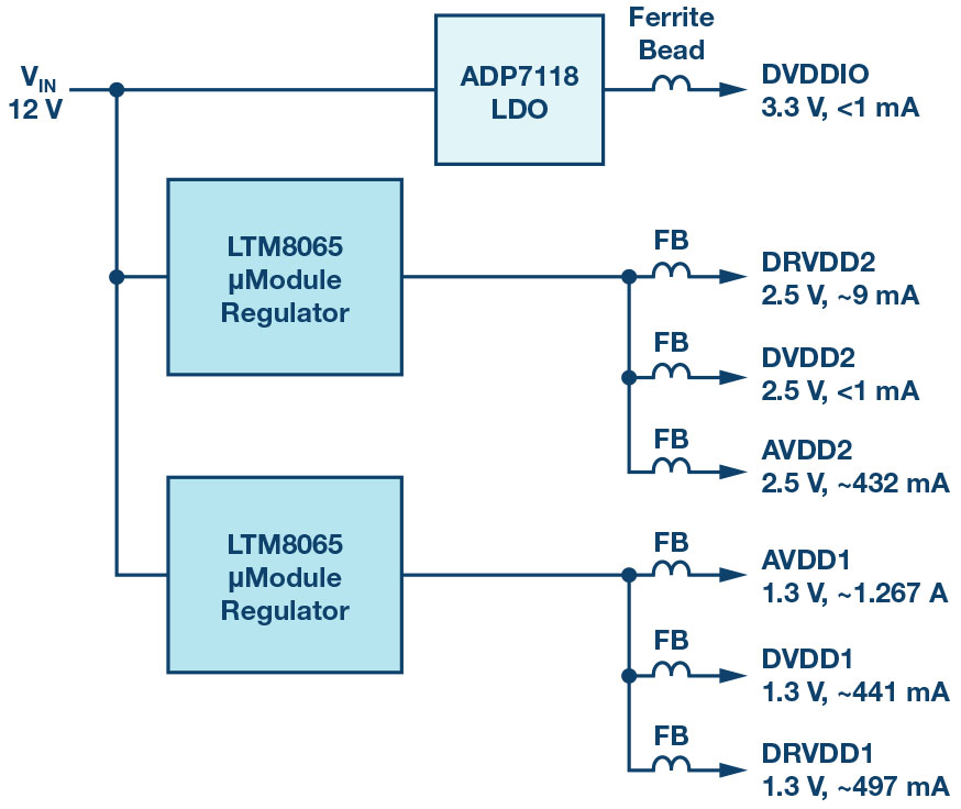 The LTM8065s directly power the 1.3 and 2.5V rails. The 3.3V rail is powered directly by an ADP7118 low noise LDO coming from a 12V supply. The 3.3V rail current is less than 1mA, so power dissipation across the LDO regulator is negligible.