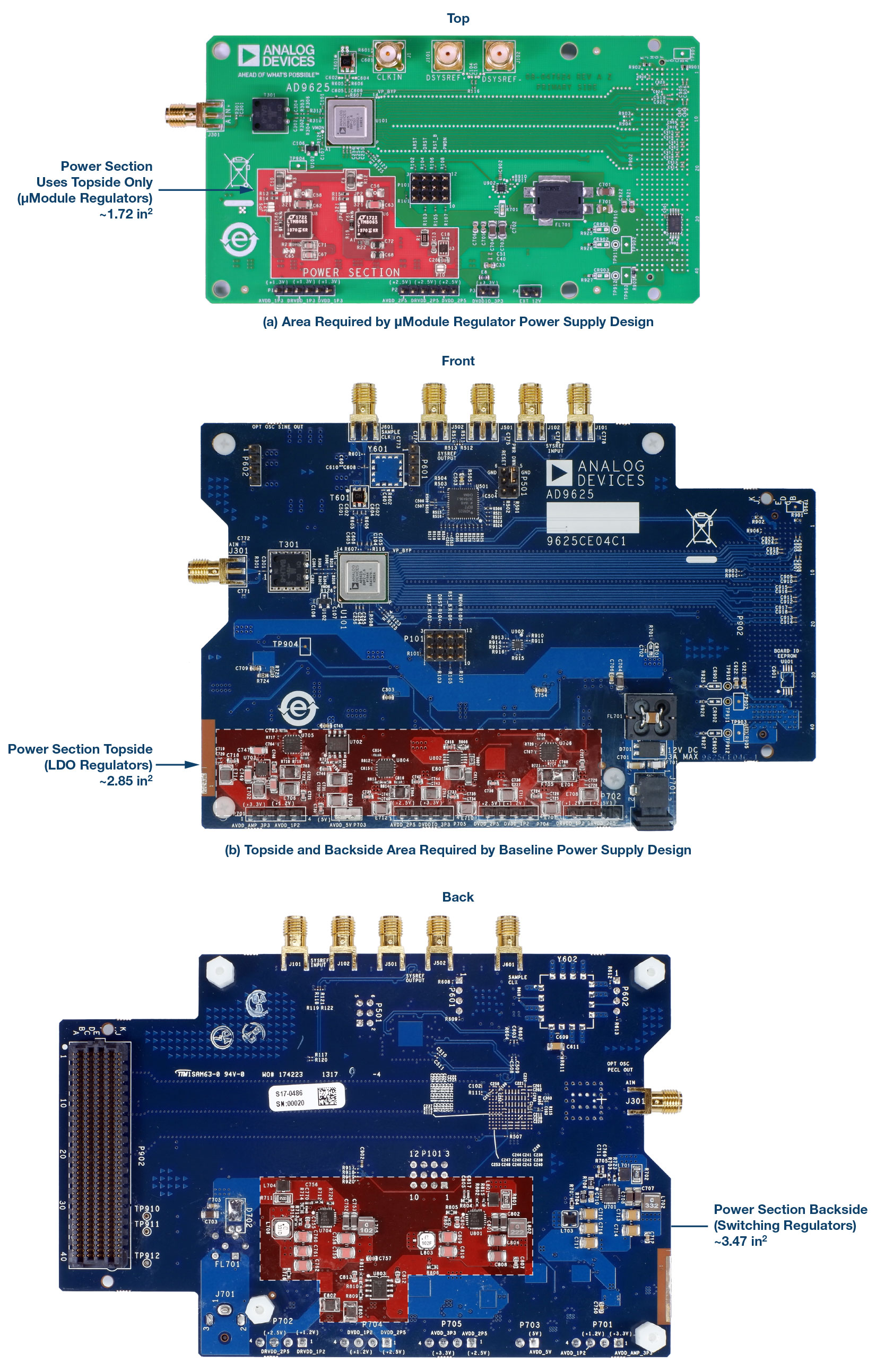 The components of the power solution using the LTM8065 reside almost entirely on the top of the PCB, while the discrete solution on the stock EVAL-AD9625 evaluation board requires power components on both the top (LDO regulators) and the bottom (switcher) sides. The LTM8065-based solution reduces the power supply footprint by over 70%.