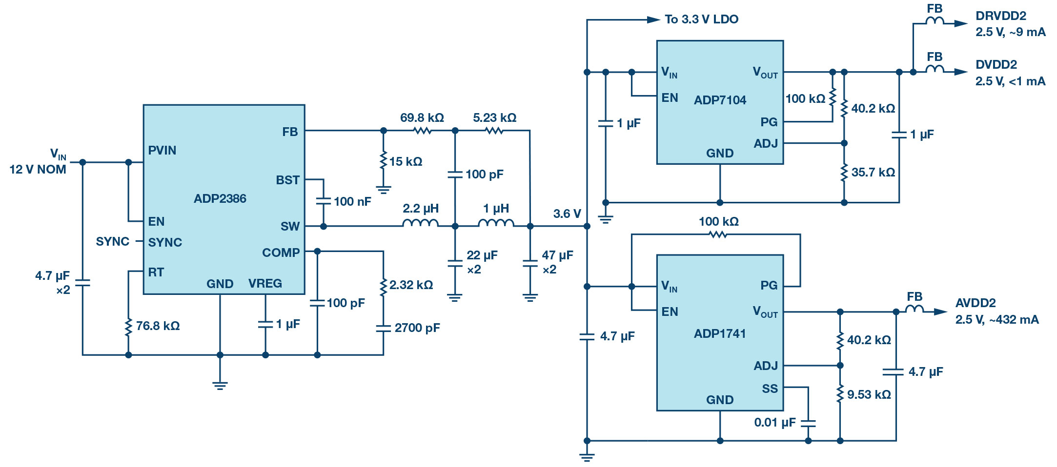 Figure 3 shows two ADP2386, 20V/6A step-down converters with LC filters, the 3.6 and 2.1V intermediate voltages and the 3.6V output regulator. These intermediate voltages are further stepped down by LDO regulators on each regulated ADC input rail. The LDO regulators provide the regulated voltages to the ADC and are effective in diminishing the output ripple from the switching regulators.