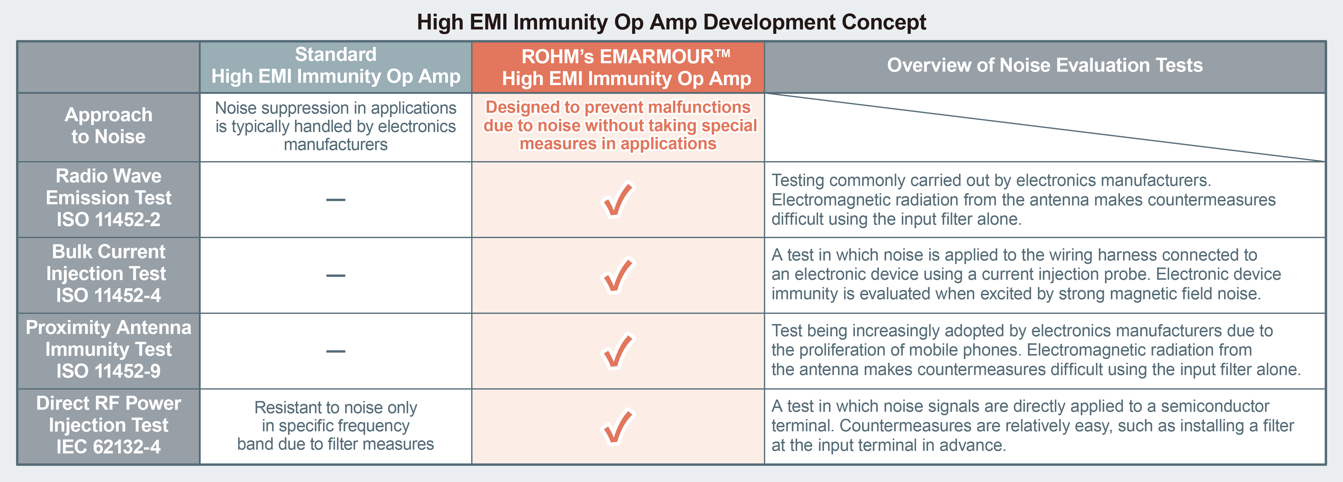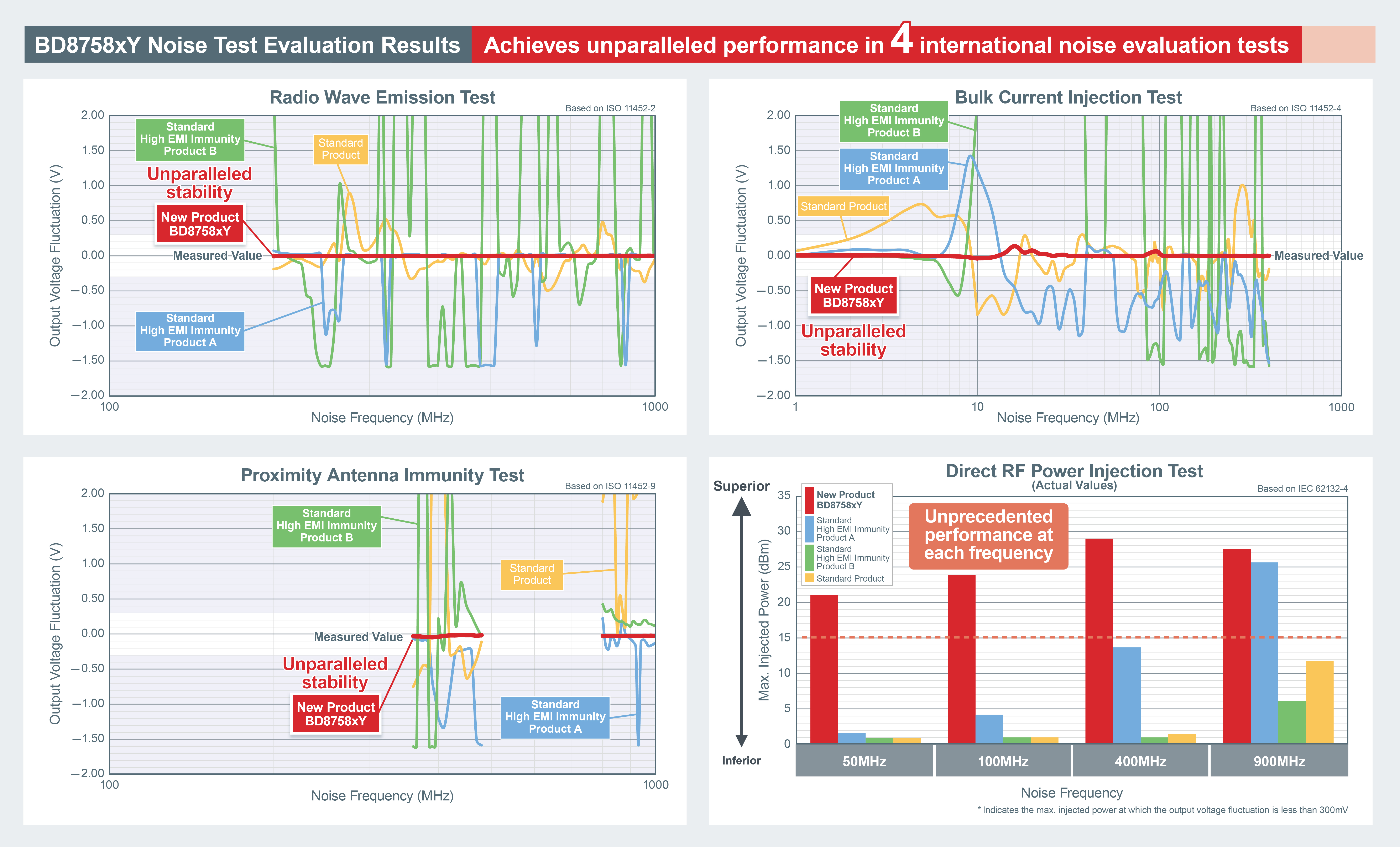 The EMARMOUR series is designed to prevent malfunctions due to noise without the need to take special application measures. The latest BD8758xY series in particular, has demonstrated its performance under four international noise evaluation tests. For example, in ISO 11452-2 radio wave emission testing conducted by vehicle manufacturers, the output voltage of standard products fluctuates by more than ±300mV in all frequency bands, while the new BD8758xY series achieves ±10mV or less. At the same time, the CMOS element structure enables accurate, high-speed signal amplification – without being affected by external noise when installed inside the targeted sensor applications. This improves reliability while reducing design production-hours in a wide range of applications, including anomaly detection systems.