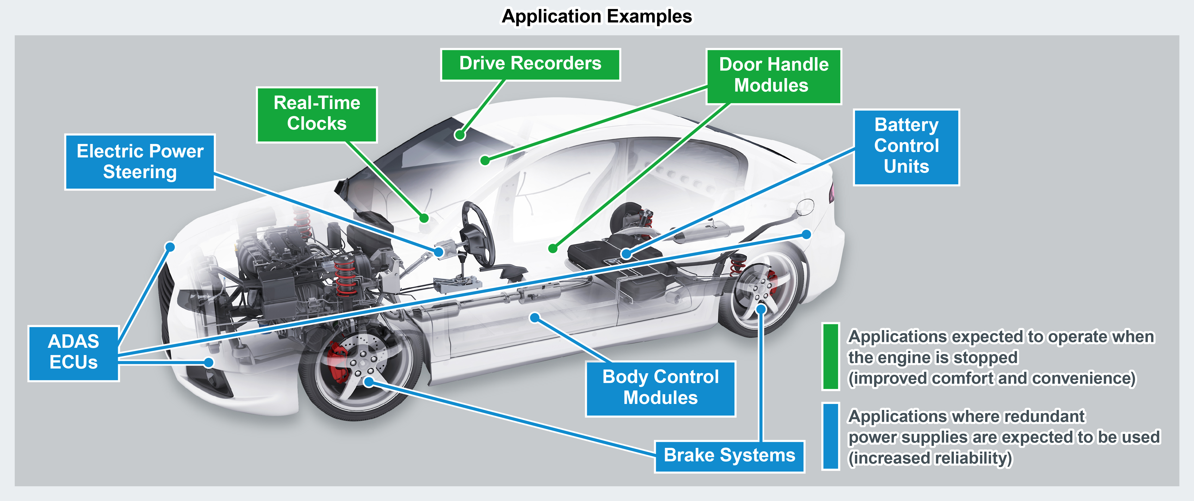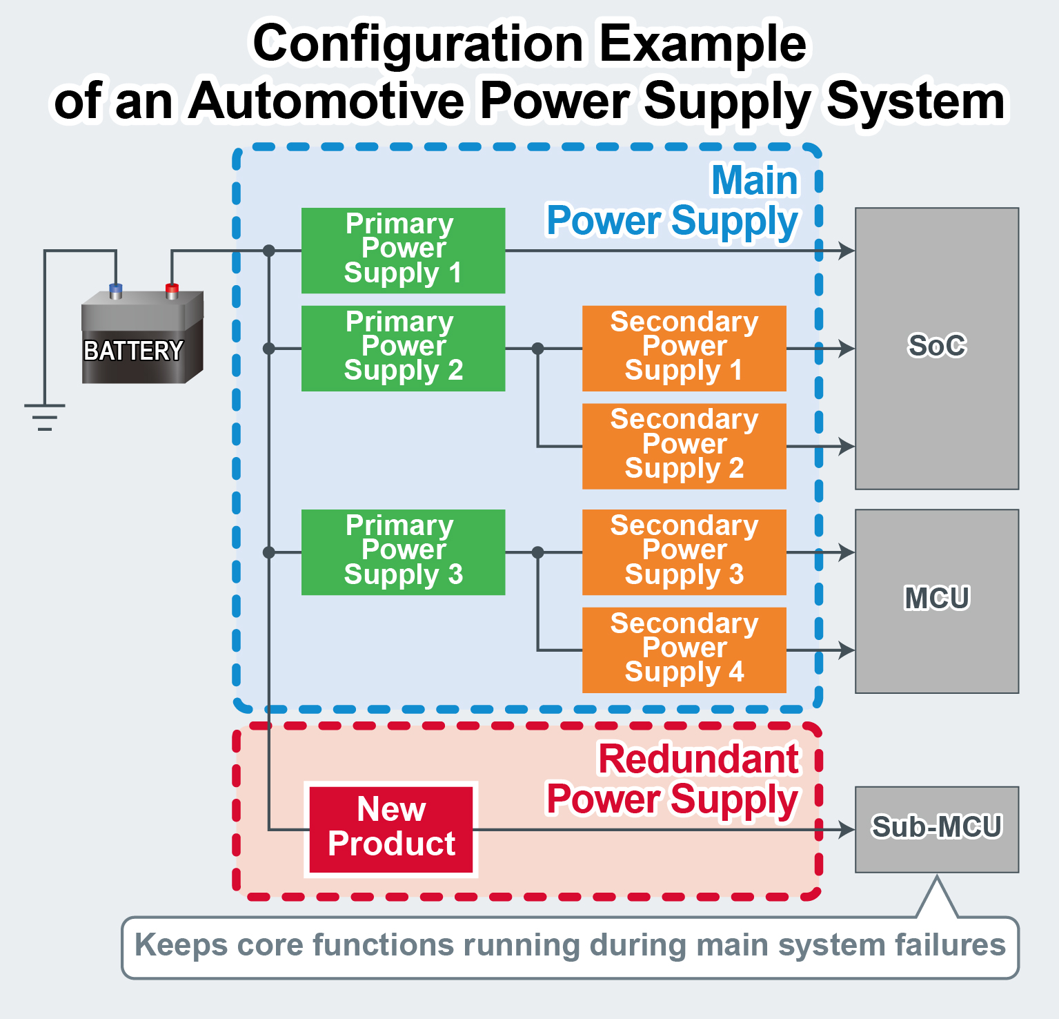In recent years, the evolution of ADAS (Advanced Driver Assistance System) and other safety measures is requiring improved reliability for systems that supply power to these applications. As a result, redundant power supplies that can continue to operate core functions (sub-MCUs) even in the event of a main system malfunction are being increasingly incorporated in automotive power supply system. And as redundant power supply circuits are added to conventional systems, they must necessarily be space-saving and consume low power. ROHM’s new products can be used as primary power supplies by taking advantage of original power supply technology accumulated over many years.