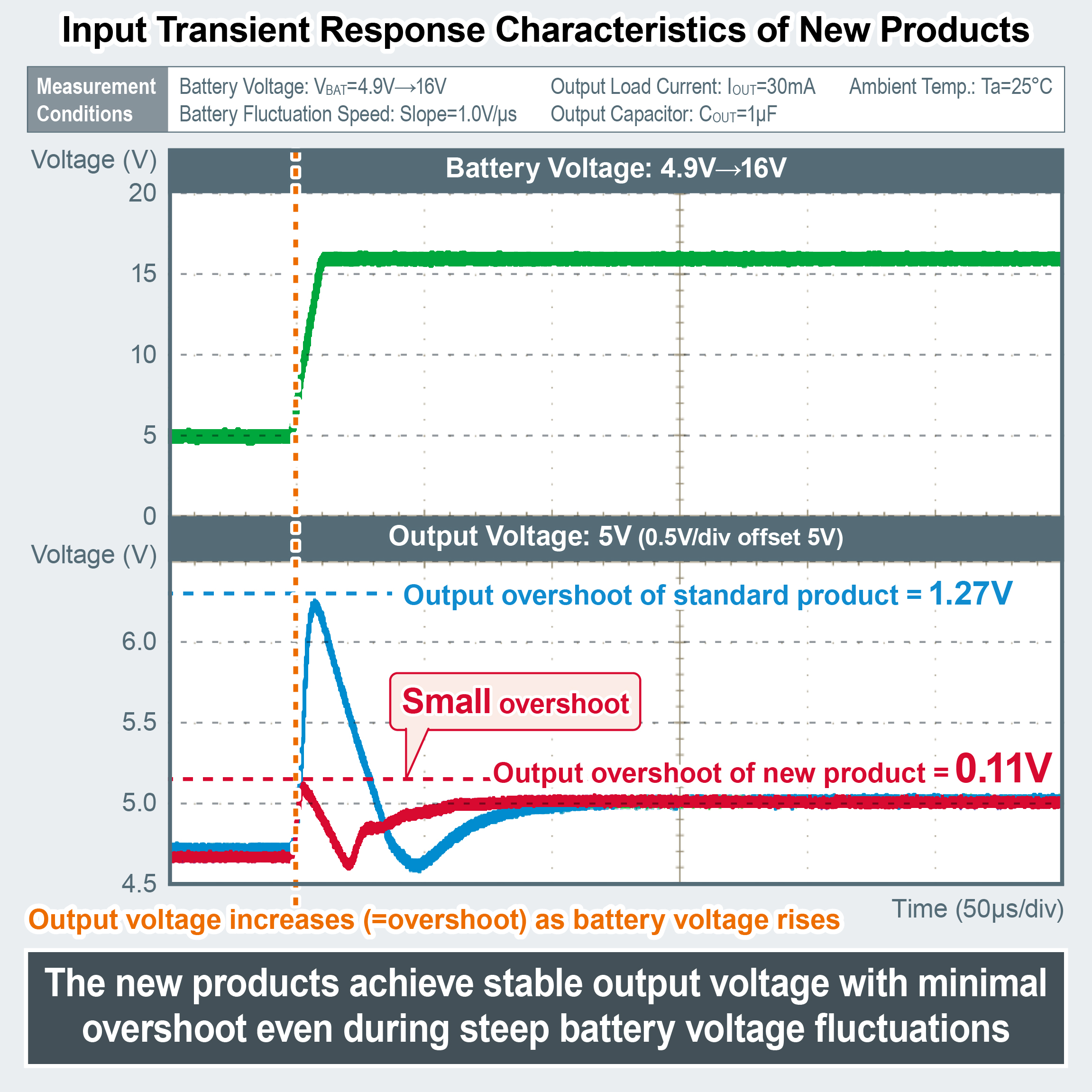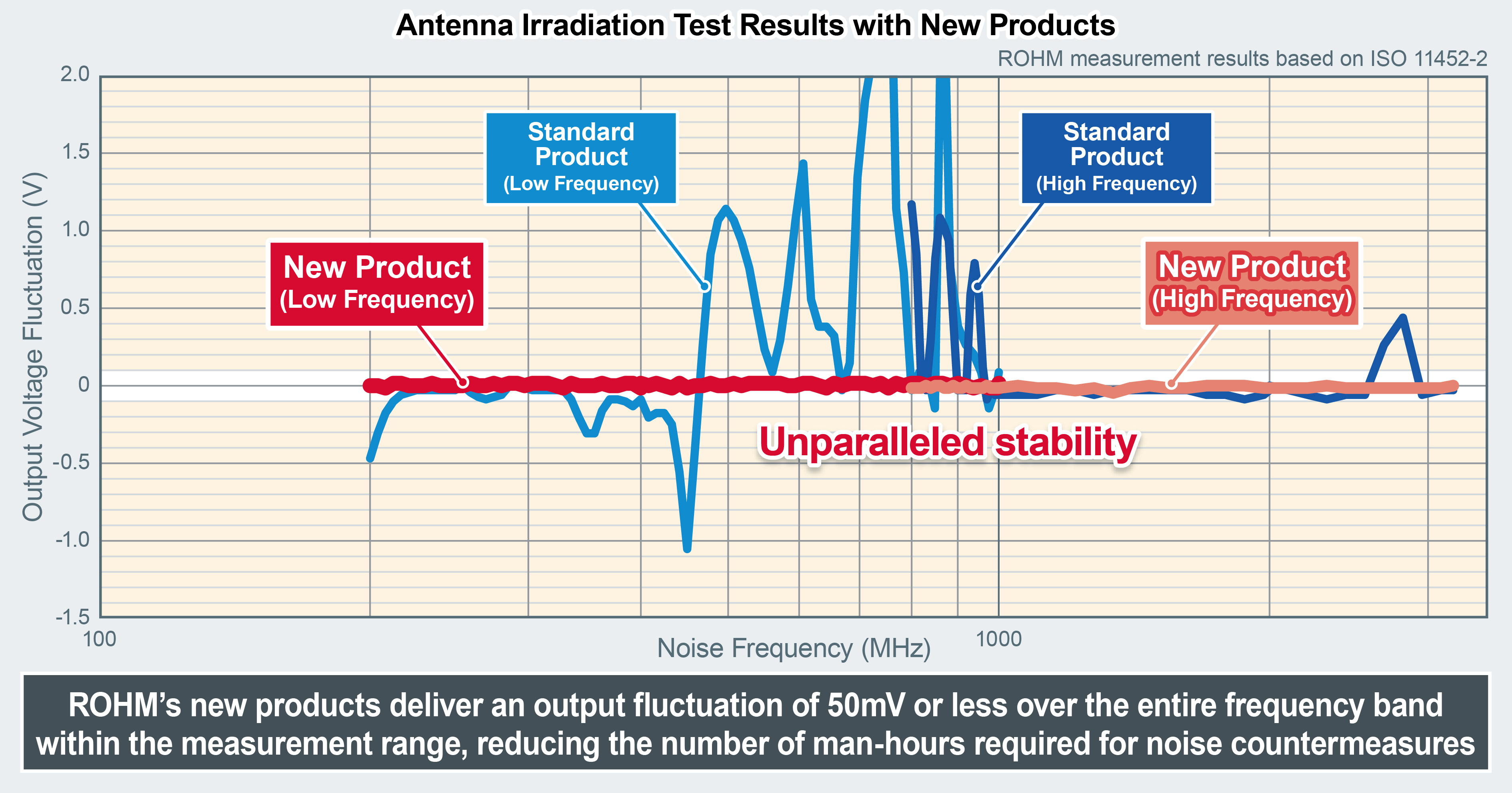 These LDOs are also highly resistant to disturbance noise, suppressing output voltage fluctuations to less than 50mV (<±1%) over the entire frequency band under ISO 11452-2 antenna irradiation testing, reducing the number of man-hours required for noise countermeasures.