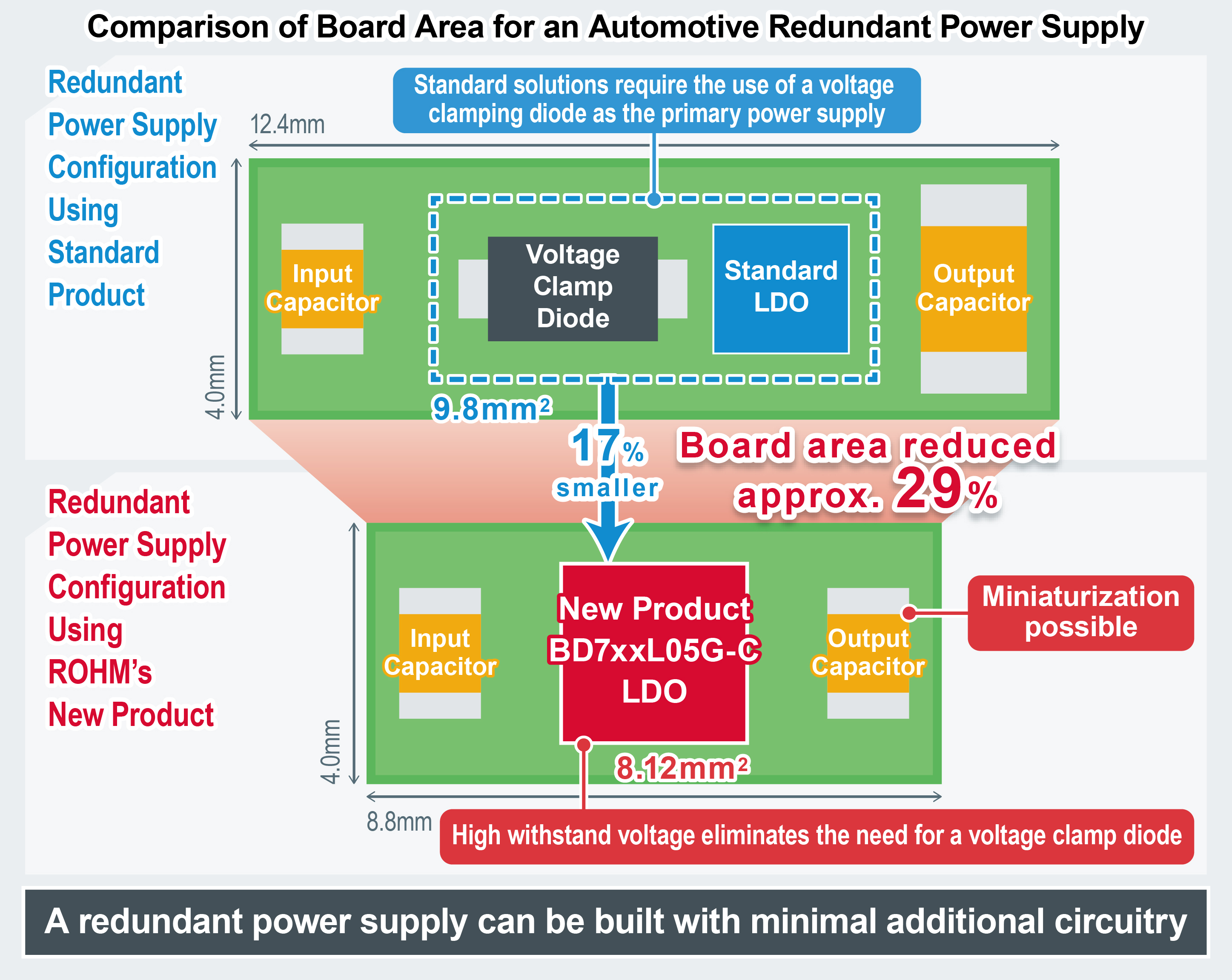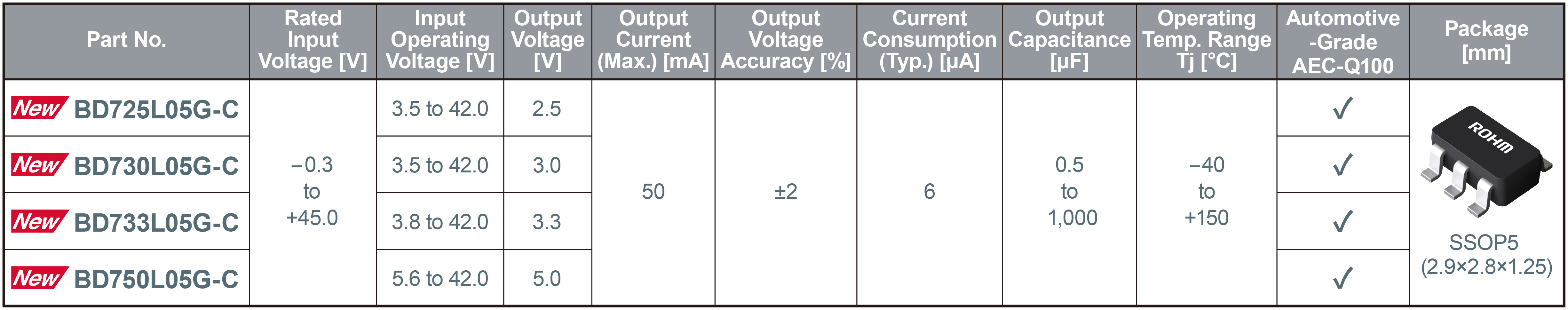 The new BD7xxL05G-C series meets basic requirements, such as a compact size, support for 125°C (Ambient Temperature) operation, qualification under the AEC-Q100 automotive reliability standard, and low current consumption demanded of automotive redundant power supplies. What’s more, they can be used as primary power supplies (45V rated input voltage) despite their small size, with a lineup that makes it possible to select the ideal solution according to the downstream device (i.e., sensor, MCU).
