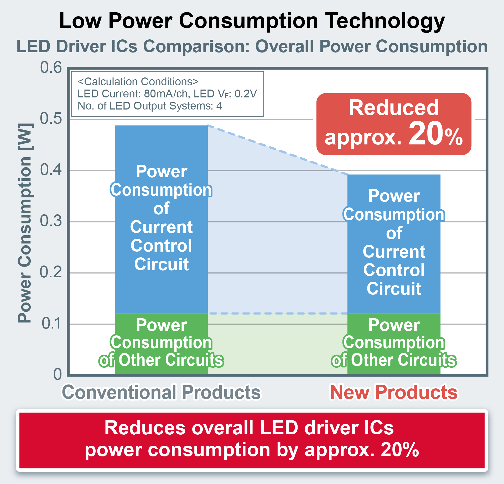 These new products leverage proprietary low power consumption technology to reduce losses in LED driver current control circuits. The result is 20% lower overall IC power consumption compared to conventional products under typical conditions (80mA/ch LED circuit current, 12V power supply). This contributes to lower power consumption in medium- to large-sized automotive displays where power consumption is an issue.