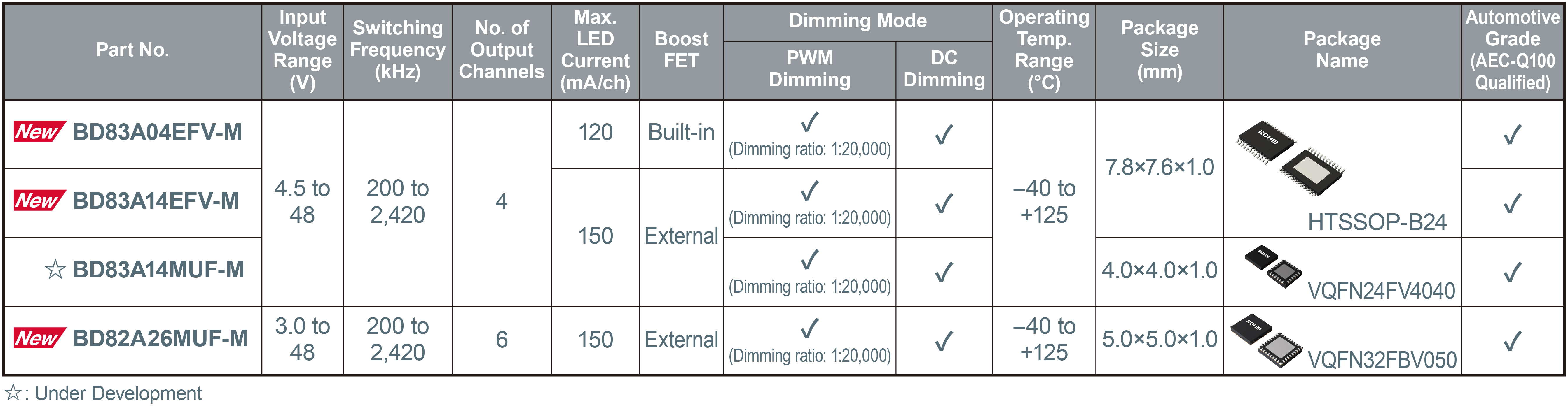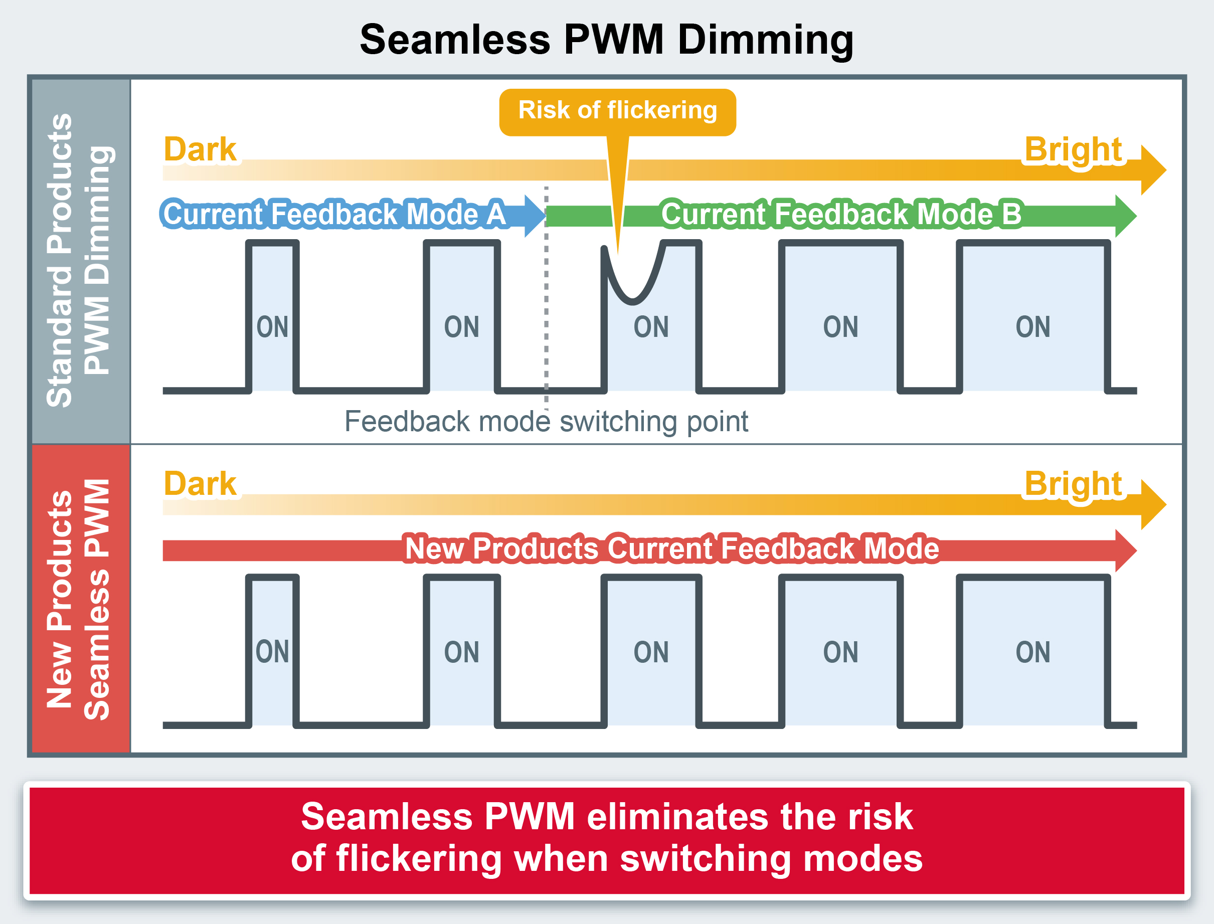 At the same time, all models are equipped with both DC and PWM dimming to meet a wide range of requirements. As there no longer exists a need to switch current feedback mode for low/high brightness change with ROHM’s original seamless PWM dimming technology, flickering that occurs with general PWM dimming is reduced, improving system reliability.