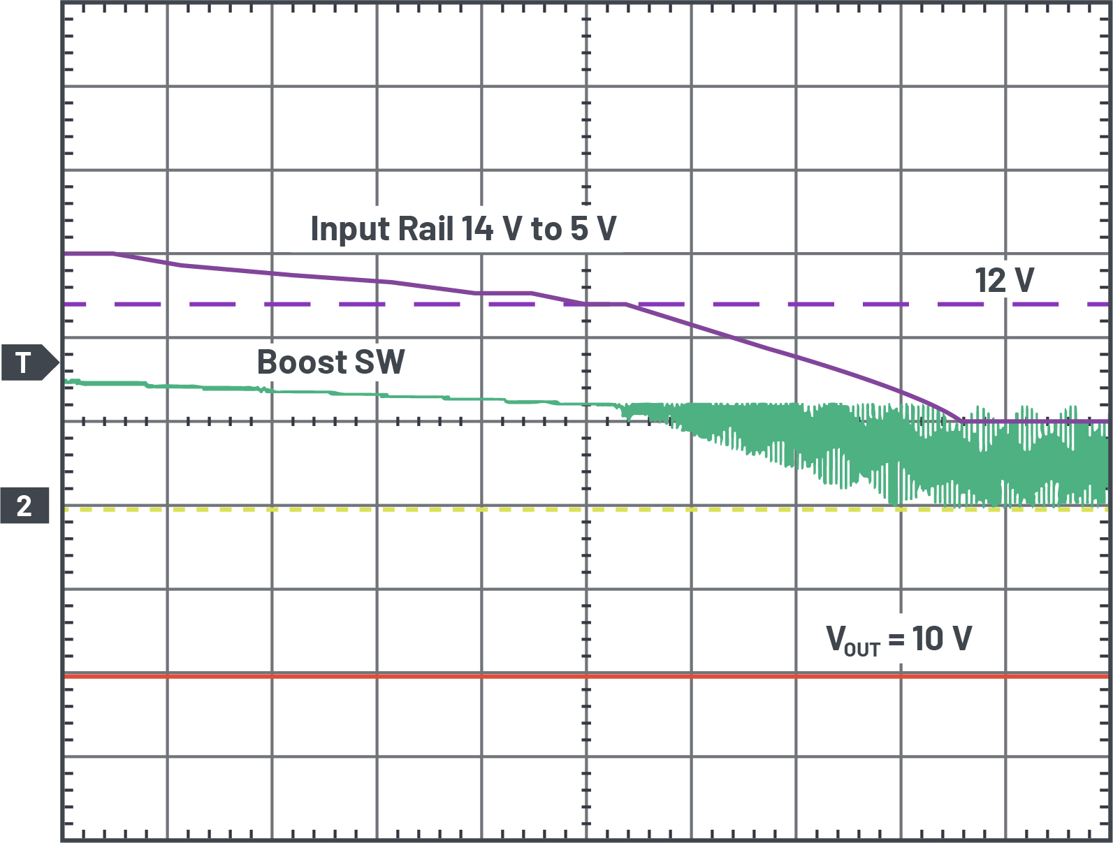 Figure 2: Waveforms showing VIN dropping from 14V to 5V. VIN = 5.0V/div, VOUT = 5.0V/div, boost SW = 10V/div, and the time scale is 200µs/div.
