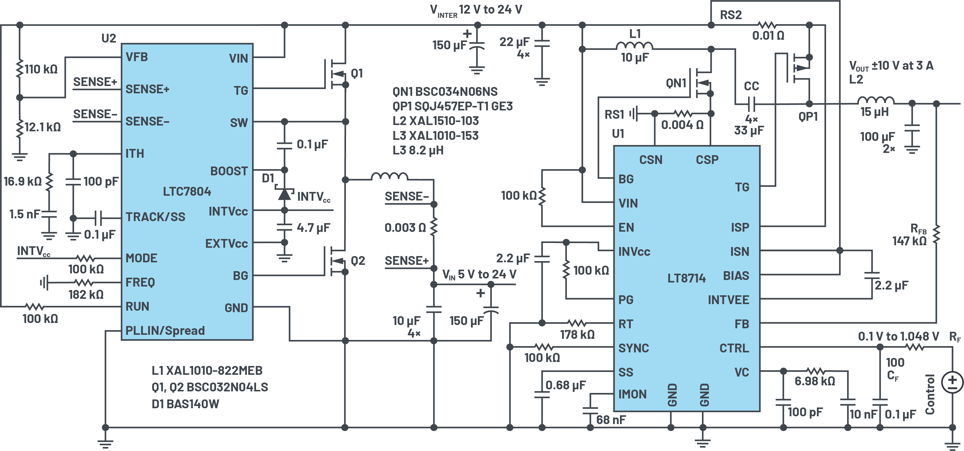 Figure 1: Electrical schematic of bi-polar, bi-directional, two-terminal power supply: VIN = 5 V to 24 V, VOUT = ±10 V at 3 A.
