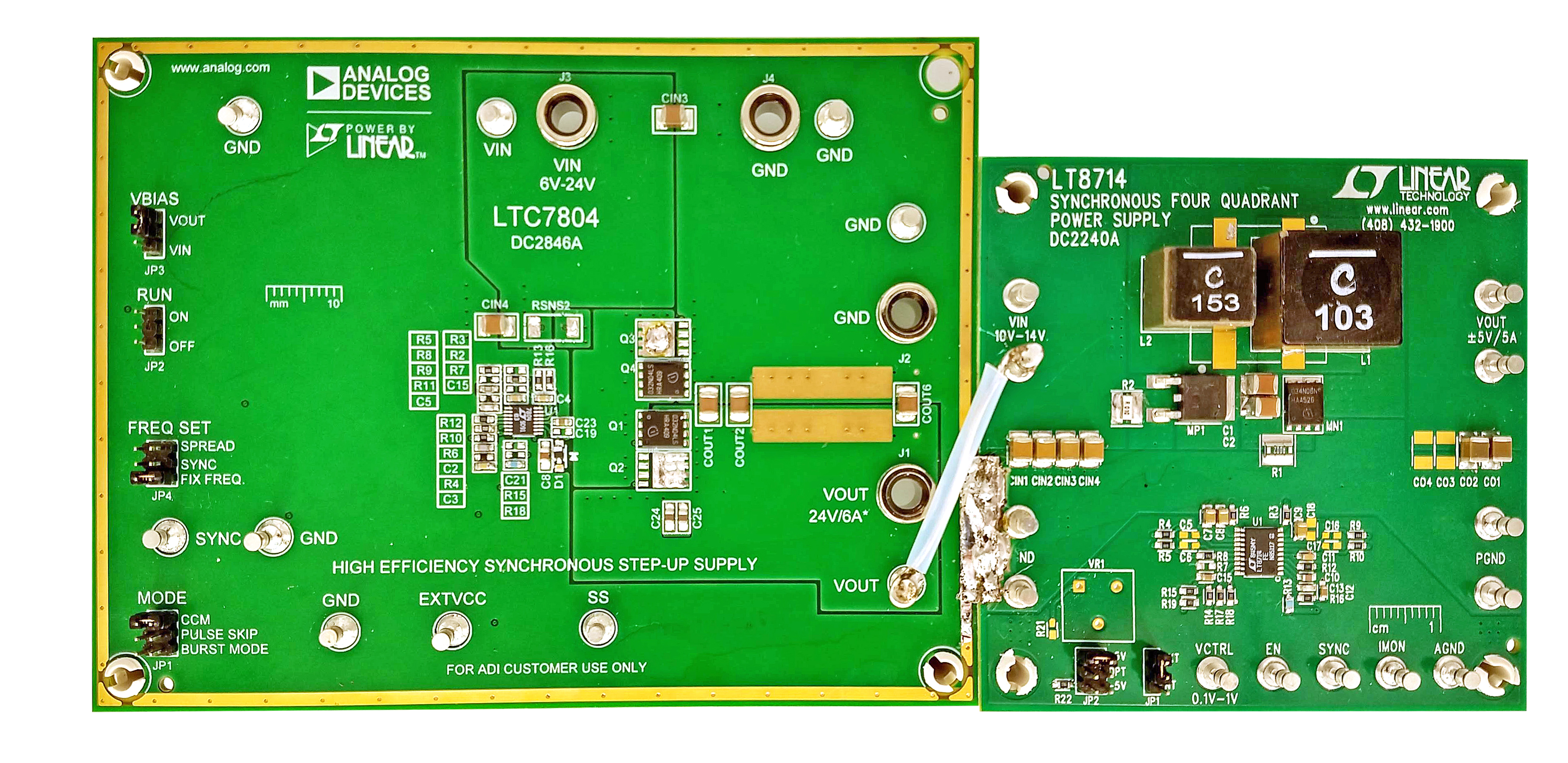 Figure 3: Left, the LTC7804 (DC2846A) and the LT8714 (DC2240A) on the right.