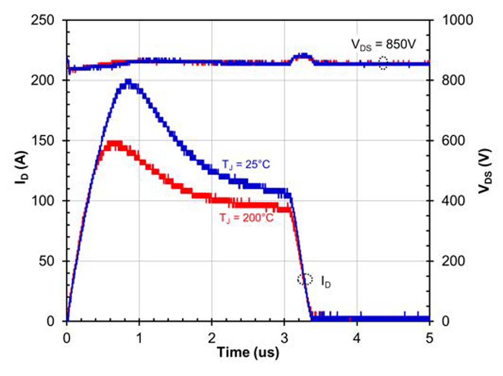 Figure 4: SiC FET short circuit current reduces with time and starting temperature