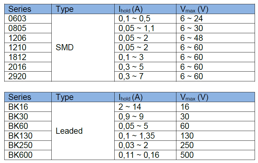 The SMD variants offer resettable miniature overcurrent protection with a holding current IHOLD of up to 7A and a maximum voltage of 24V, 30V, 48V, or 60V. They impress with their fast response to fault current and their low profile, whose compact design allows more space on the PCB. The SMD fuses are RoHS compliant, lead and halogen-free, certified to UL/CULE482628, RoHS2011/65/EU TUV B160696048001, and DIN EN 14582:2007. They are also compatible with high-temperature soldering processes.