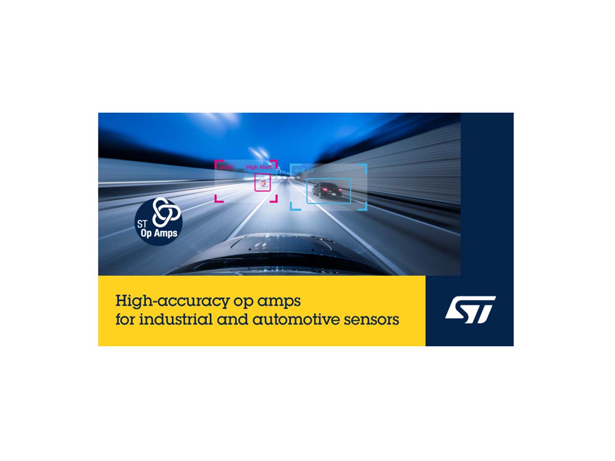 STMicroelectronics’ TSB182 dual operational amplifier is featured for high-accuracy signal conditioning with sensors, including maximum 20µV input offset voltage, 100nV/°C drift over temperature, and 4V-36V operating range for medium-voltage applications.
