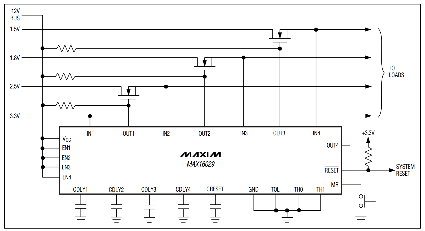 Figure 2: The MAX16029 PMIC uses capacitors to program the time delays of four independent channels, and supports DC rails up to 28V (Source: Maxim Integrated datasheet)