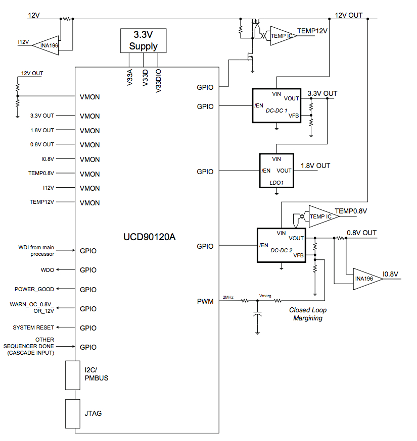 Figure 5: The UCD90120A can sequence and monitor up to 12 rails, with additional supply-related sensing and control options (Source: TI datasheet)