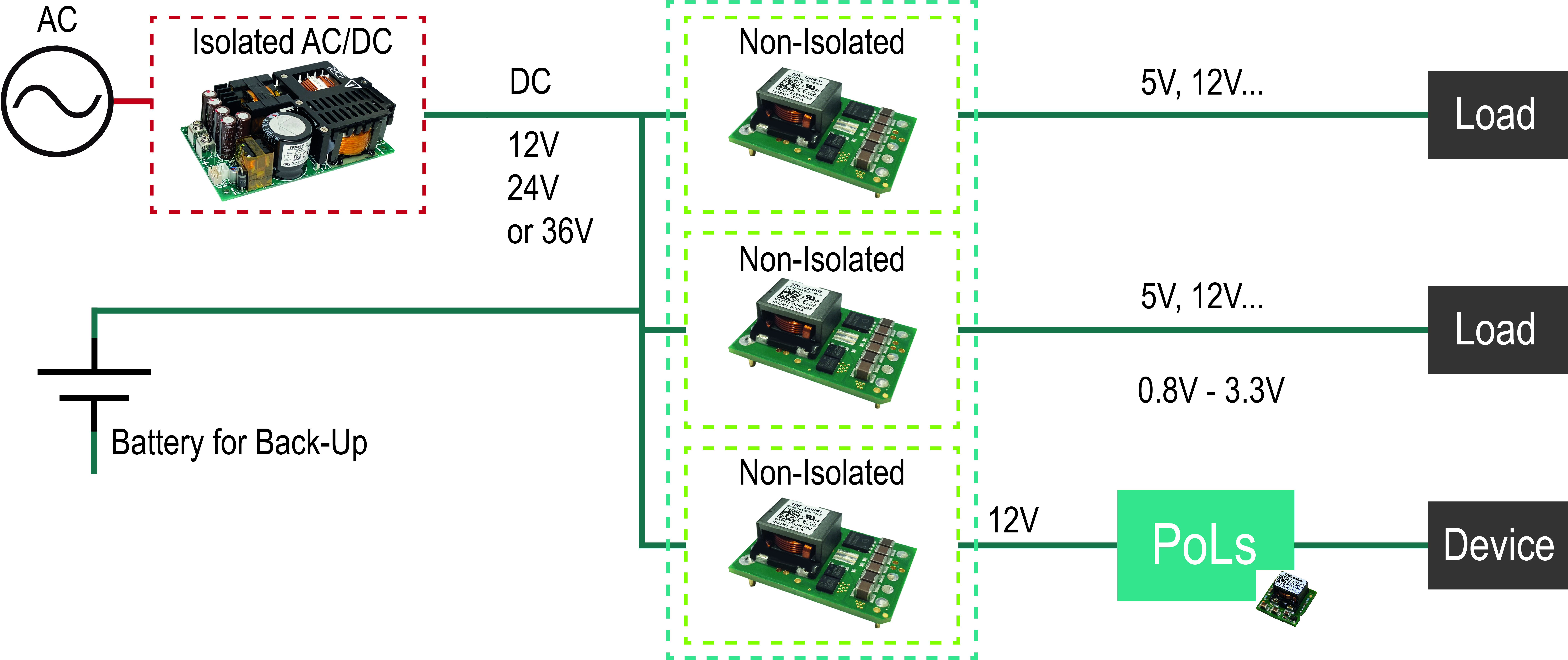 Datacomms and telecomms system cost and technology enhancements have altered the way DC/DC converters are used and what products are needed. This has resulted in new types of distributed power architectures (DPA) being deployed over the last two decades. The supply voltage for ASICs, FPGA and other microprocessors has reduced from 5V to less than 1V. Initially the 24V and 48V DC AC/DC supplies powered isolated DC/DC converters. Now very low cost, non-isolated point of load (PoL) converters, situated next to the processors requiring very fast transient response performance, have replaced many of them. Many datacomms and computing systems now use a 12V AC/DC power supply and the PoLs have wide input ranges, capable of operating from either 5V or 12V DC. Non-isolated DC/DC converters can be used as the protective primary-secondary safety barrier is situated within the AC/DC power supply. This also applies to medical applications.