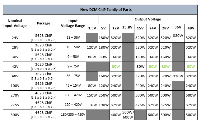Table 1 – Vicor’s DCM Family – Items in green are new DCM ChiPs available in standard and enhanced VOUT regulation. Items in black have been previously announced.