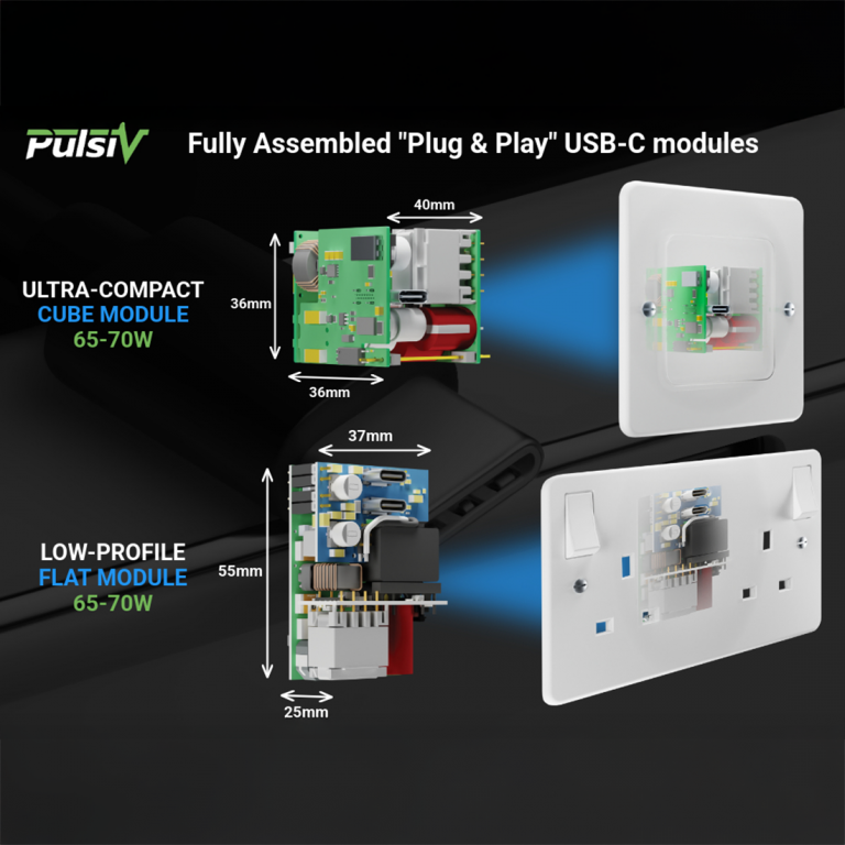 The UK-based power electronics specialist unveiled a new line of fully assembled 65W–70W USB-C modules that deliver impressively high efficiency, extremely low temperatures, and compact form factors – targeted at integration into wall sockets, desks, and furniture. To learn more, I sat down and spoke with Nick Theodoris, Director of Global Sales & Distribution at Pulsiv, about the core features of this exciting new solution.