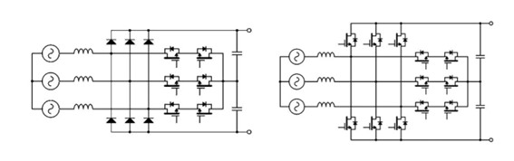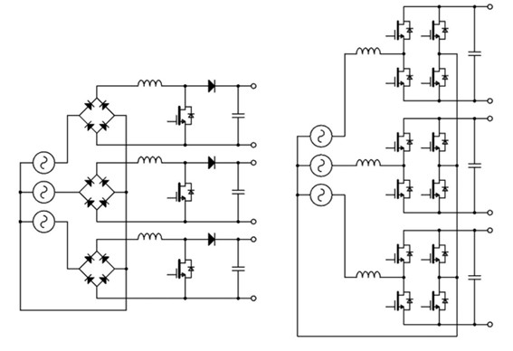 Figure 1: The basic ‘modular’ three-phase boost PFC stage left, and the totem-pole PFC, right