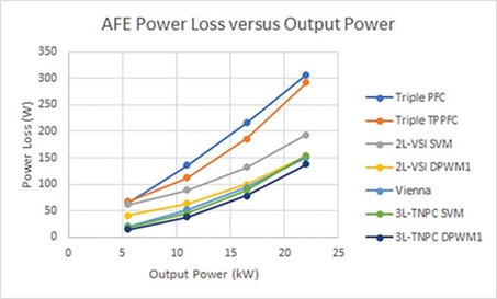 As expected, the ‘modular’ triple PFC and TPPFC approaches have highest losses with multiple semiconductors in the power paths. The 2L-VSI topology with fewer in-line switches is next best with space vector modulation (with almost identical loss as sine-triangle modulation), and with DPWM1 modulation it can rival the Vienna rectifier, at least at higher power levels. The 3L-TNPC with SVM offers further marginal improvement, but with DPWM1 modulation scheme, losses are lower still.