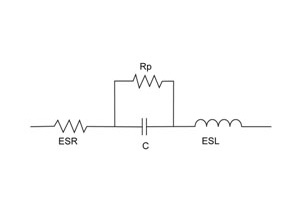 The capacitor equivalent circuit comprises four elements (Figure 1, below): capacitance, equivalent series inductance (ESL) – the sum of inductive elements including leads, a high resistance DC path (Rp) in parallel with the capacitance, and Equivalent Series Resistance (ESR) – the series resistive effects combined into a single element.