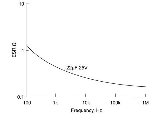 Figure 3: Typical relationship beween ESR and frequency for tantalum capacitors (AVX)