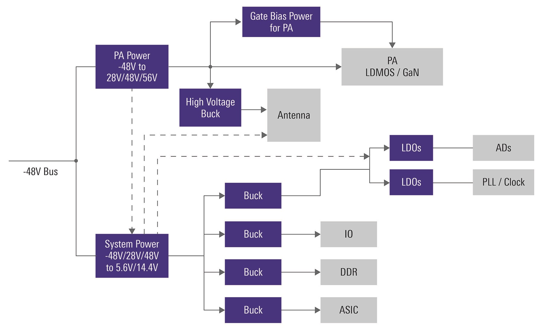 FIGURE 1: Typical 5G AAU power tree diagram (AC source not shown).