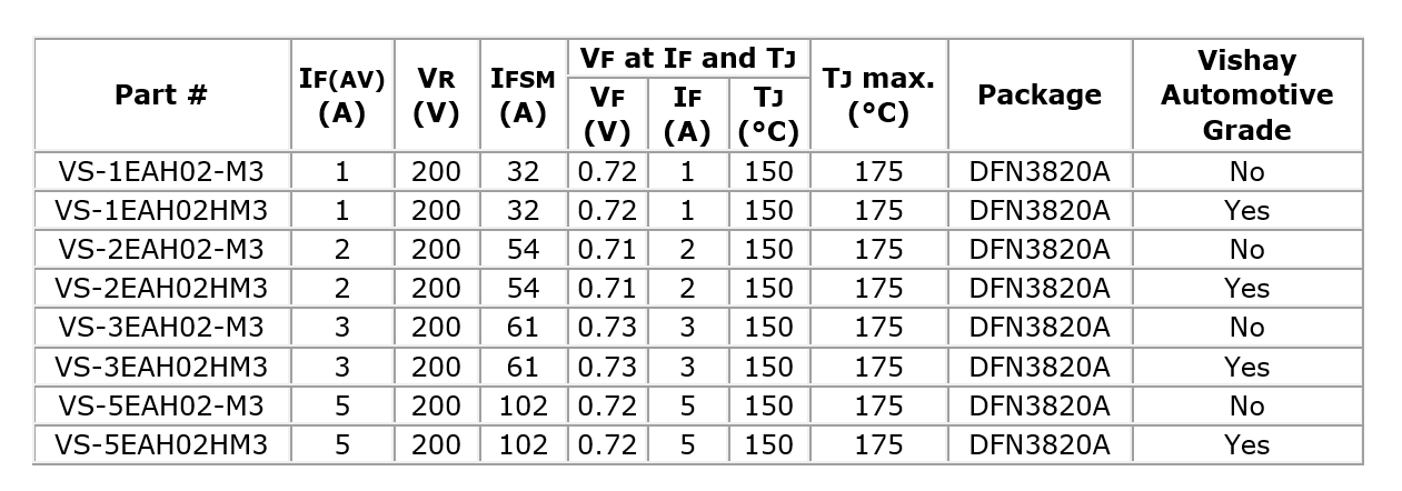 Providing space-saving and efficient solutions for commercial, industrial, and automotive applications, the 1A VS-1EAH02xM3, 2A VS-2EAH02xM3, 3A VS-3EAH02xM3, and 5A VS-5EAH02xM3 are each available in Vishay Automotive Grade, AEC-Q101 qualified versions.