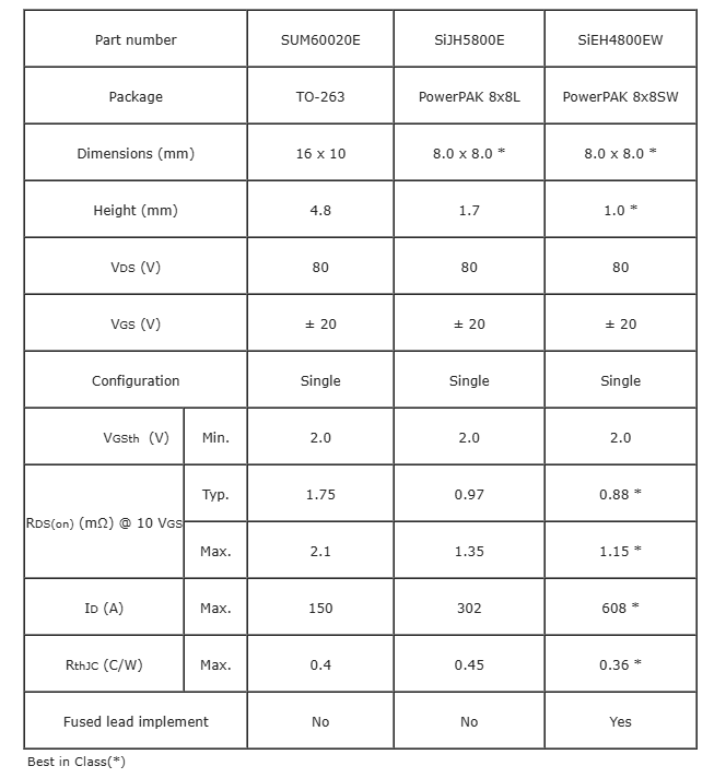 The SiEH4800EW implements a fused lead to increase the source PAD solderable area to 3.35mm², which is four times larger than a traditional PIN solder area. This decreases the current density between the MOSFET and PCB, reducing the risk of electro-migration risk and enabling a more robust design. In addition, the device’s wettable flanks enhance solderability while making it easier to visually inspect the reliability of solder joints.