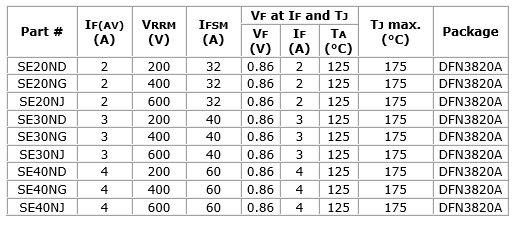 Compared to devices in the SMP (DO-220AA) package with the same footprint, the AEC-Q101-qualified SE20Nx, SE30Nx, and SE40Nx offer a 12% lower profile and double the current rating. In addition, the rectifiers offer equivalent or higher current ratings to larger devices in the conventional SMB (DO-214AA) and SMC (DO-214AB) packages, as well as the eSMP series SlimSMA (DO-221AC), SlimSMAW (DO-221AD), SMPA (DO-2212BC), and SMPC (TO-2778A).