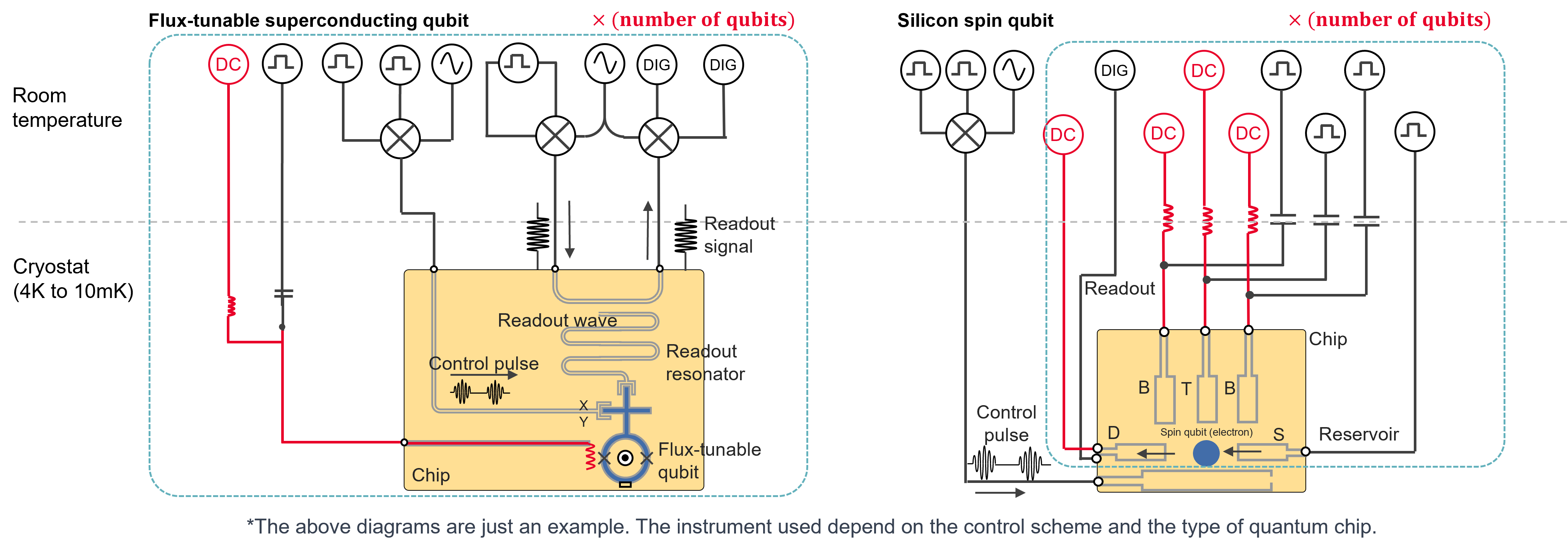 Figure 1. Single qubit control and evaluation system for flux-tuneable superconducting and silicon spin qubits. The instruments and lines indicated in red represent the DC voltage bias source and wiring. For the flux-tuneable superconducting qubit, the DC voltage bias source helps tune the resonance frequency using the magnetic flux generated in the coil. For the silicon spin qubit, the DC voltage bias source works by tuning the electric potential of gate terminals.