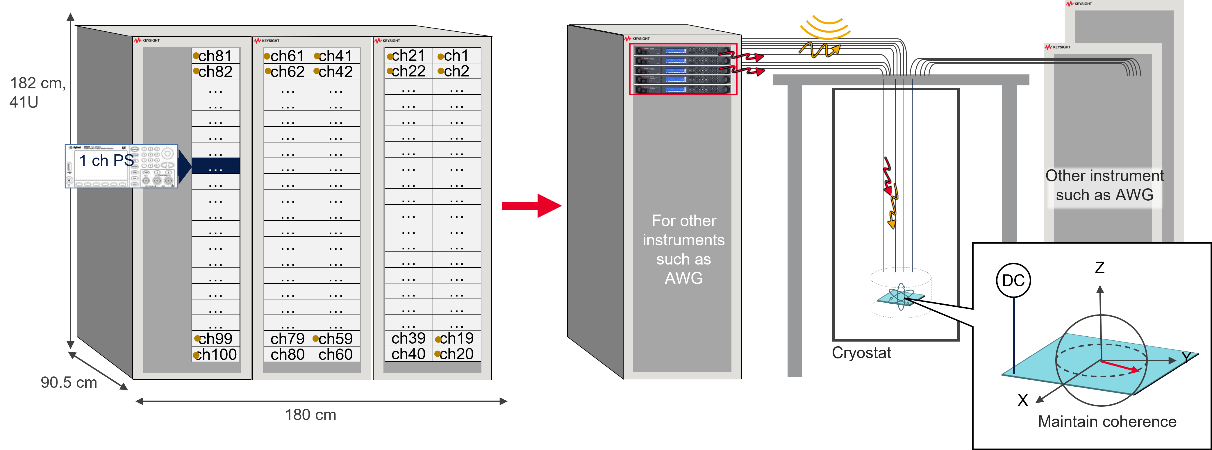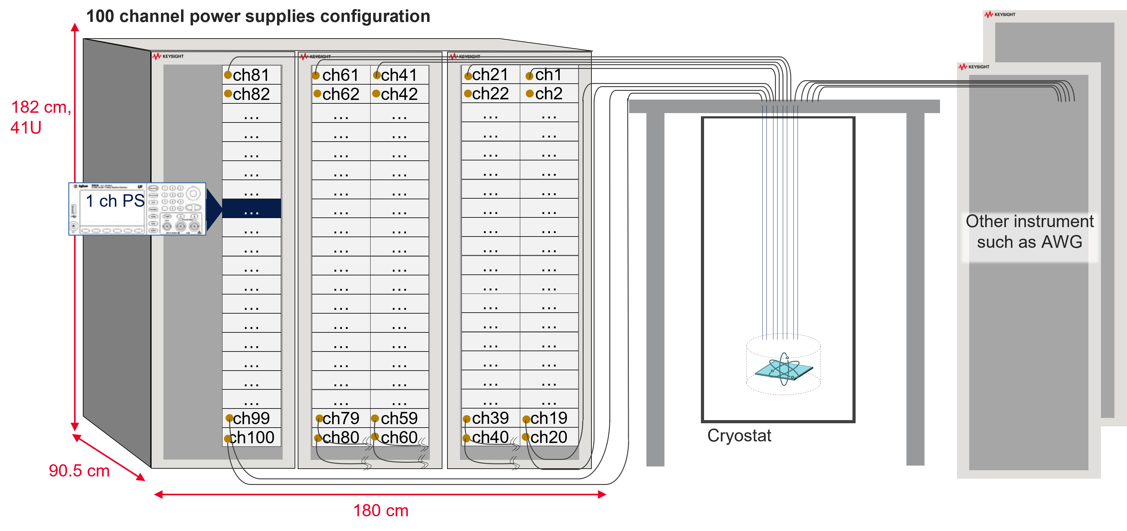Taking an example of a quantum computer that uses 100 qubits, providing DC bias voltage to each qubit presents an additional challenge. Figure 3 illustrates that each qubit requires at least one DC power supply. The test rack must fit in a minimum of 100 power supply channels to bias all qubits. Even with power supplies of a typical size 2U half-rack housed in a maximum-sized rack, a single rack can only store 40 channels.