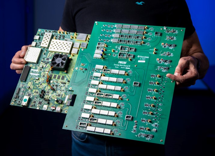The Fermilab engineering team has taken advantage of a new commercial FPGA chip, the first to integrate digital-to-analogue and analogue-to-digital converters directly into the board. It substantially speeds up the process of creating the interface between the FPGA and RF boards, which would have taken months without it. To improve future versions of its control and readout system, the team has started designing its own FPGA hardware.