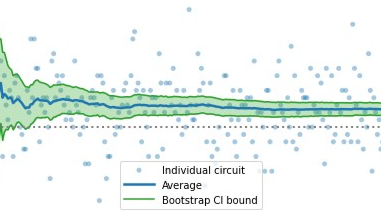 The plot above shows the individual heavy output probability for each circuit in the Quantum Volume 8192 test. The blue line is the cumulative average heavy output probability, and the green regions are the cumulative two-sigma confidence interval calculated by the new method.