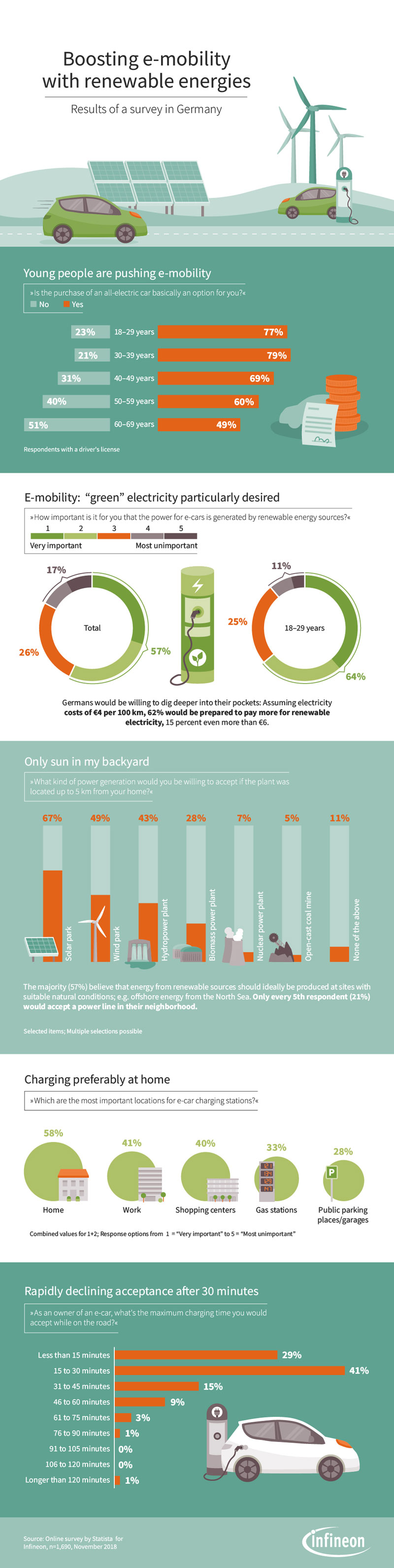 Conversely, 18% of respondents who are unwilling to use an e-car reject all forms of energy generation in their own vicinity. In comparison, only seven percent of the participants in the study, for whom an e-car is an option, reject it. Nuclear power plants and open-cast coalmines clearly lag behind in terms of acceptance, with rates of seven and five percent, respectively.