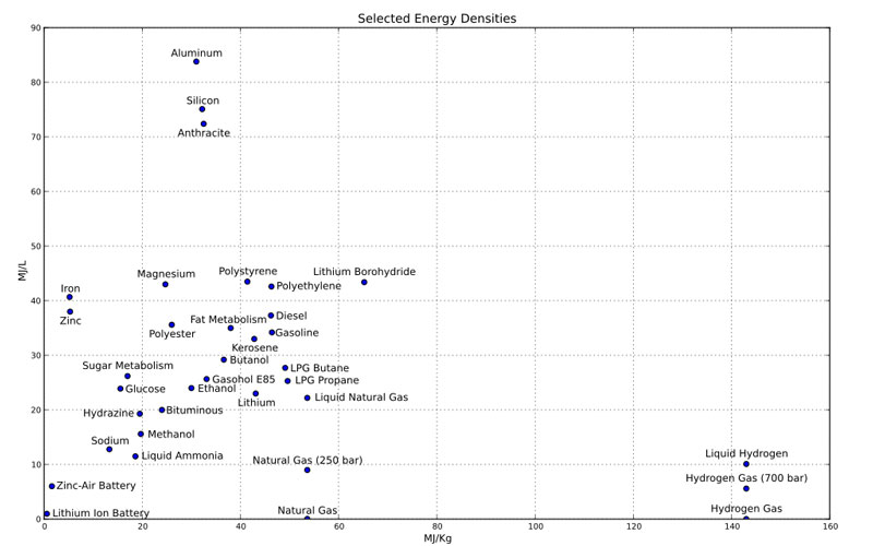 Figure 1: Fossil fuels have a multi-million year advantage in terms of energy density, but advances in energy storage chemistries and smart technologies are making both fossil and renewables more efficient. (Source: Wikipedia)