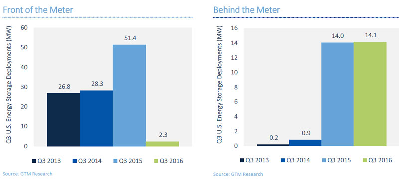 According to GTM Research, the total energy storage deployments dropped in Q3 2016, versus Q3 2015, as there were no >1-megawatt projects brought online. On the upside, behind-the-meter deployments increased slightly.
