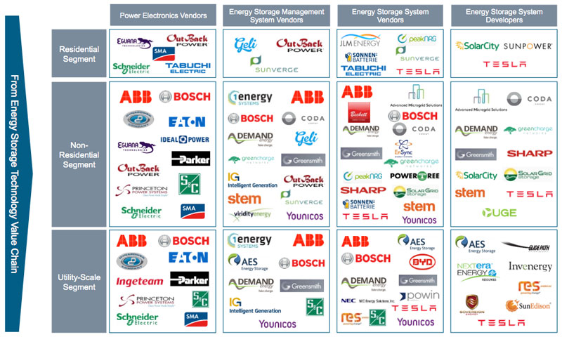 Figure 3. Energy storage has many players in an ecosystem that spans from residential to utilities, and from power electronics to energy storage systems providers and system developers. (Source: GTM Research)