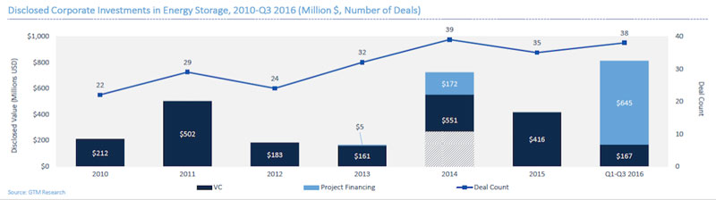 GTM Research puts the Q3 2016 total corporate investments at $659.8m, 5x that of Q3 2015 ($131.6m).