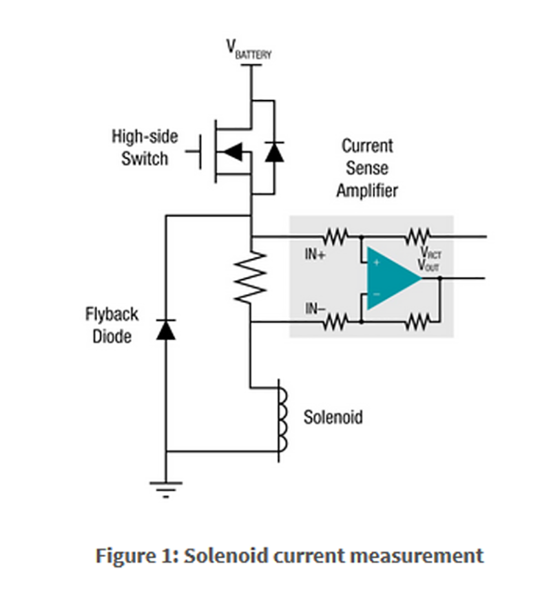 As shown in Figure 1, a shunt resistor is inserted in between the switch and the solenoid. The low-ohmic shunt is inserted in such a way to create a low resistance path as well as safely measure and accommodate recirculation current flows. An amplifier in a differential configuration or current sense amplifier is connected to the shunt to measure the current.