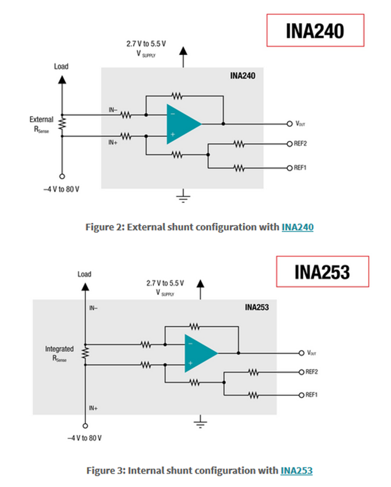 Figures 2 and 3 shows the configurations of shunt for external and internal configurations. In Figure 2 shunt is external to the device (INA240-Q1) and in Figure 3 shunt is internal to the device (INA253-Q1).