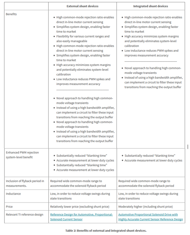 Solenoid current sensors can be designed with external shunts or integrated shunt devices depending on the accuracy requirement. Each has their own advantages. Tables 1 and 2 summarise the differences and benefits of these two architectures.